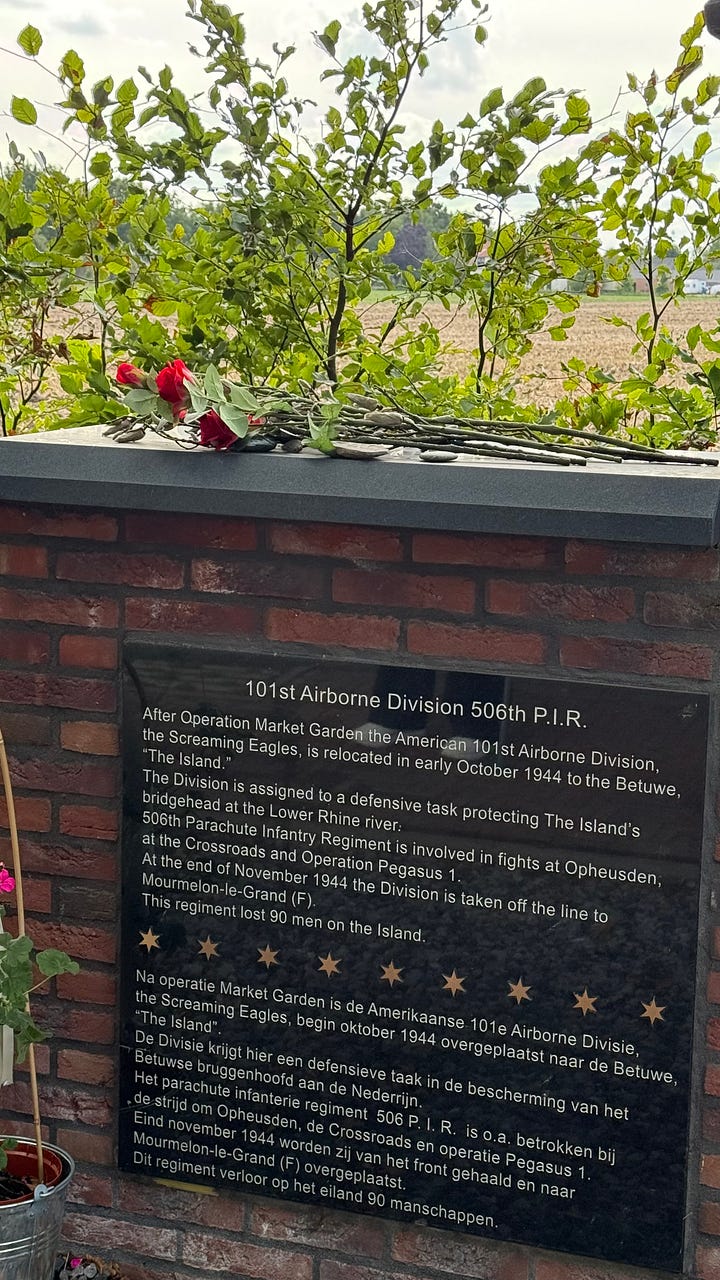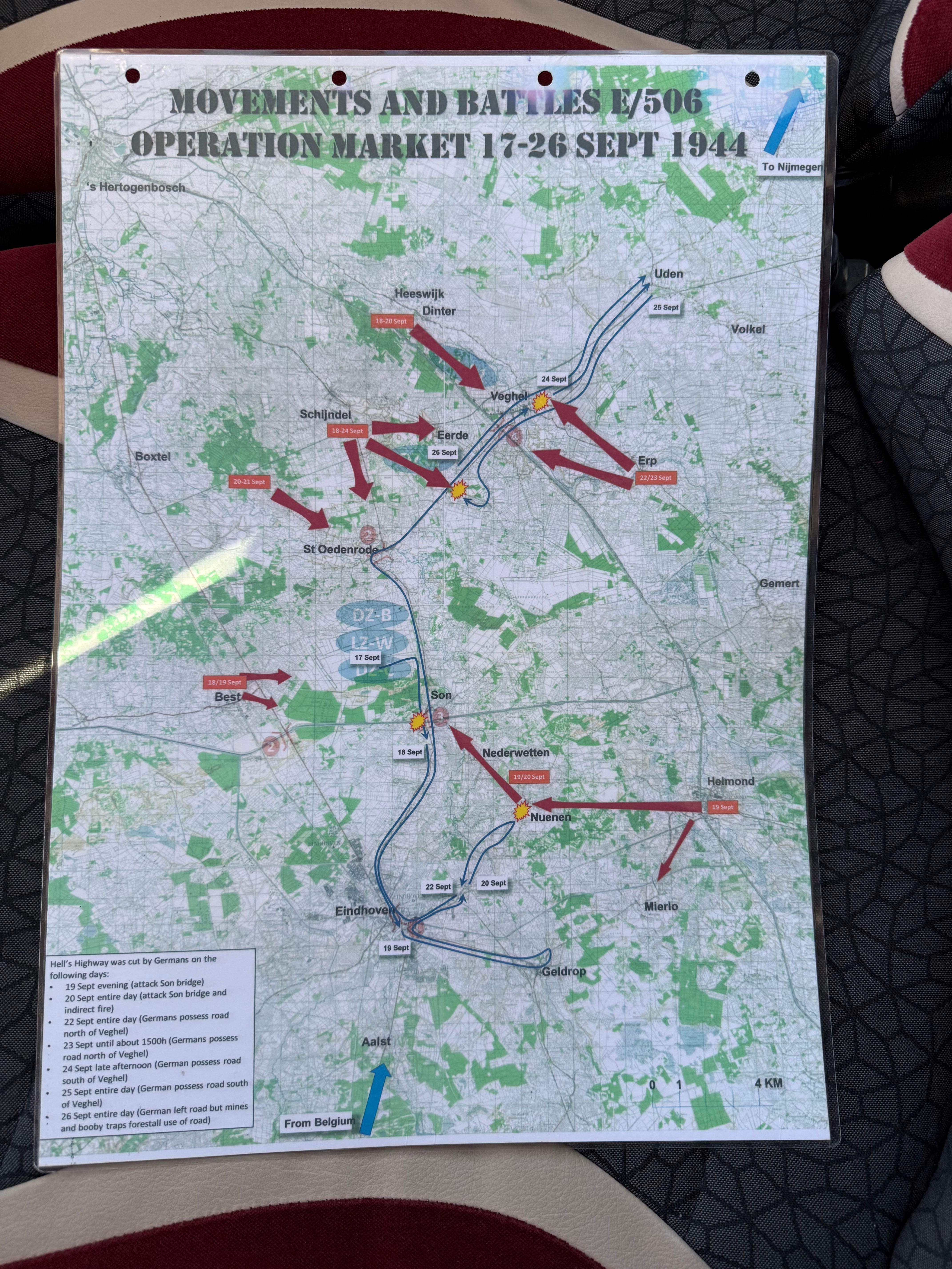 Our next stop was at the site of the Son Bridge over the Wilhelmina Canal. The Son Bridge was an objective of the 101st Airborne to keep the road intact for the advancing British tank units. As you might expect, there were many bridges in this low country dotted with canals and rivers. As they approached the bridge from the north (they jumped north of the canal in the Sonse Forest), the Germans detonated the bridge! The history above talks about the effort to install the Bailey Bridge. The Germans retook the bridge several times and closed it to the Allies. Here’s a map of the 101st Airborne actions and dates during Operation Market that we took a photo of that our historian had for reference: