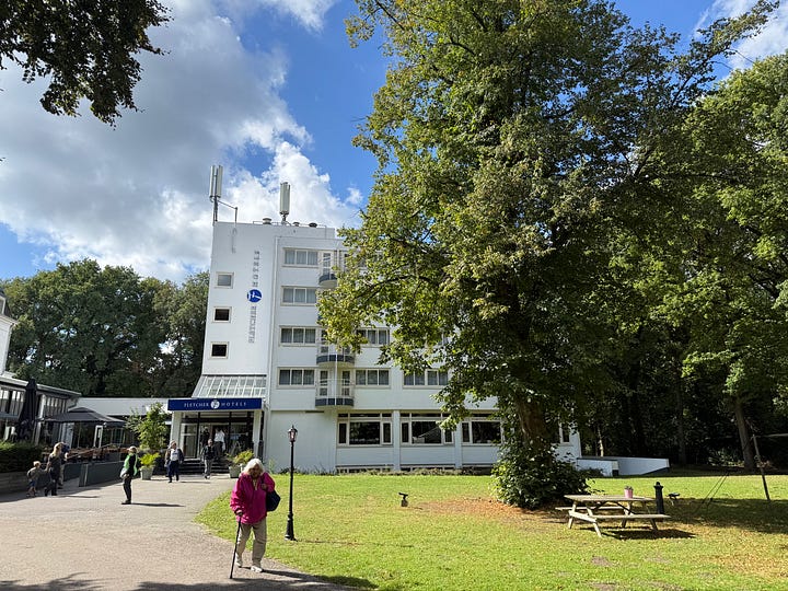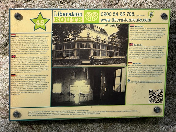 My brain is already full! Fortunately, we stopped for a great buffet lunch at this point in the tour at the beautiful Hotel Erica in the countryside outside of Nijmegen. This hotel is in a group of historical hotels in the Fletcher group. Our host at the hotel was Marcel Hoogenboom, who is the grandson of a Dutch resistance fighter who died in 1945. Here is an excerpt of the story of this hotel and the Hoogenbooms, which is on the Liberation Route in Europe, from a story page they gave us at lunch: