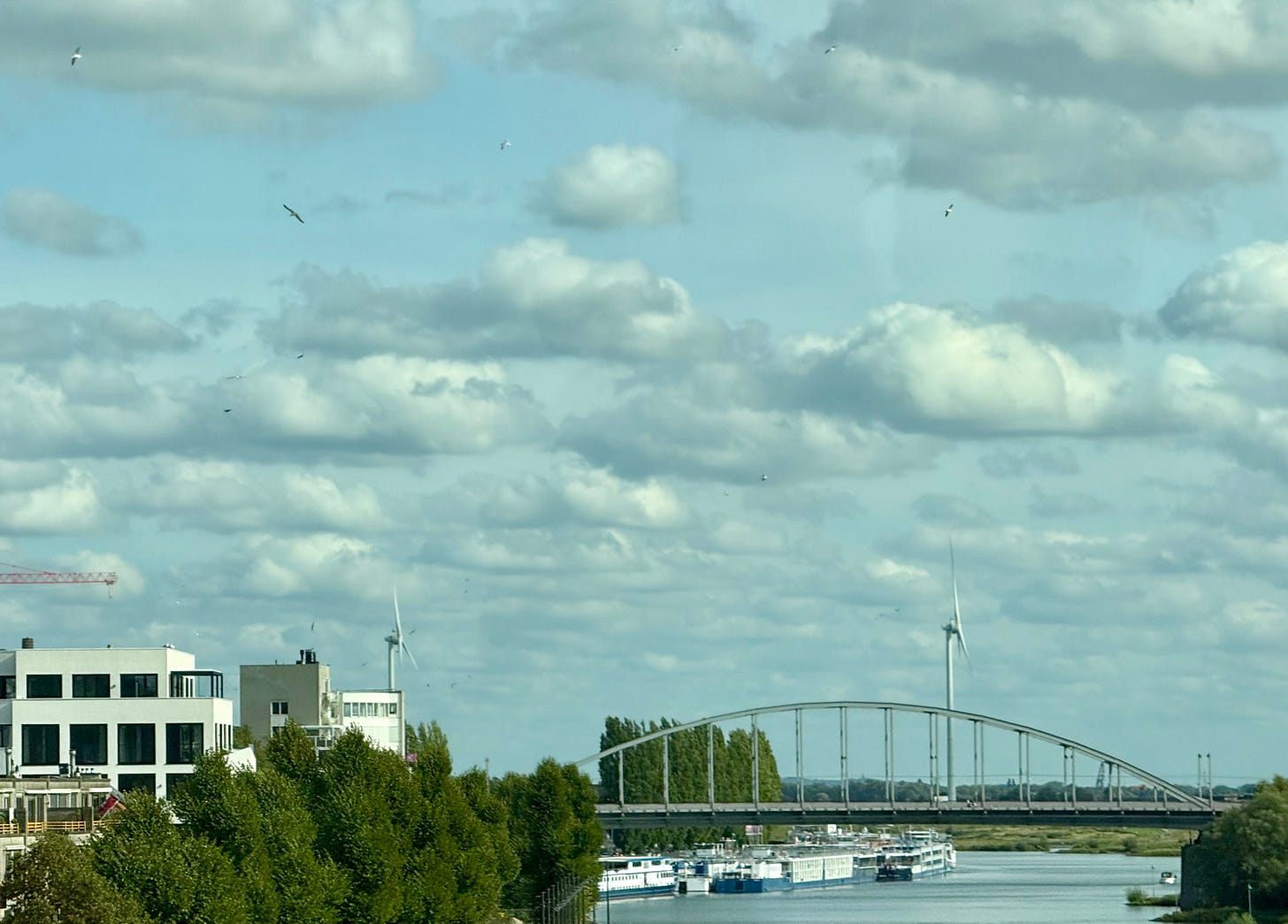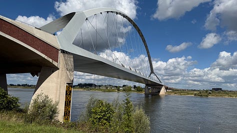 Unfortunately, we were unable to stop to view our final objective today, the Arnhem Bridge (since renamed the John Frost Bridge, after Major General John Dutton Frost, who led the 1st British Airborne troops in the failed attempt to take the bridge). We drove over the bridge and saw it from a distance (bad bus photo):