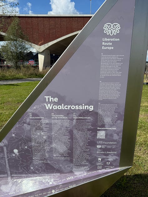Our afternoon was action-packed! First, we had a stop by the Waal river (a branch of the Rhine) in Nijmegen to hear the story of the 82nd Airborne, 504th Regiment and their boat trips across that river to try and secure German and defeat German forces on the North side and secure two bridges from both ends. They suffered heavy losses, with 48 paratroopers killed. After the inability for the British 1st Airborne to retain the bridge at Arnhem, the enemy front advanced again as far south as Nijmegen. Here are some pictures from the stop at Nijmegen, including the new Nijmegen bridge: